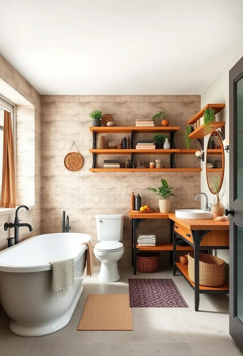 A vintage apothecary cabinet brings rustic charm to your bathroom, serving as both a conversation starter and a functional storage solution. Imagine a wall-mounted piece adorned with intricate woodwork, its original character preserved through time. This eye-catching cabinet can be a beautiful display for an array of delicate items such as small potted plants, handcrafted soaps, and luxurious skincare products. Each shelf can tell a story, showcasing your favorite botanical scents or artisanal finds, which helps create a serene spa-like atmosphere in your space.