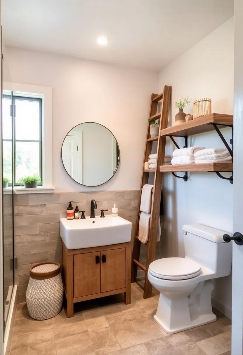 Rustic Ladder shelves: use a reclaimed wooden ladder as a creative shelving solution for towels and decorative items, adding a touch of farmhouse charm
