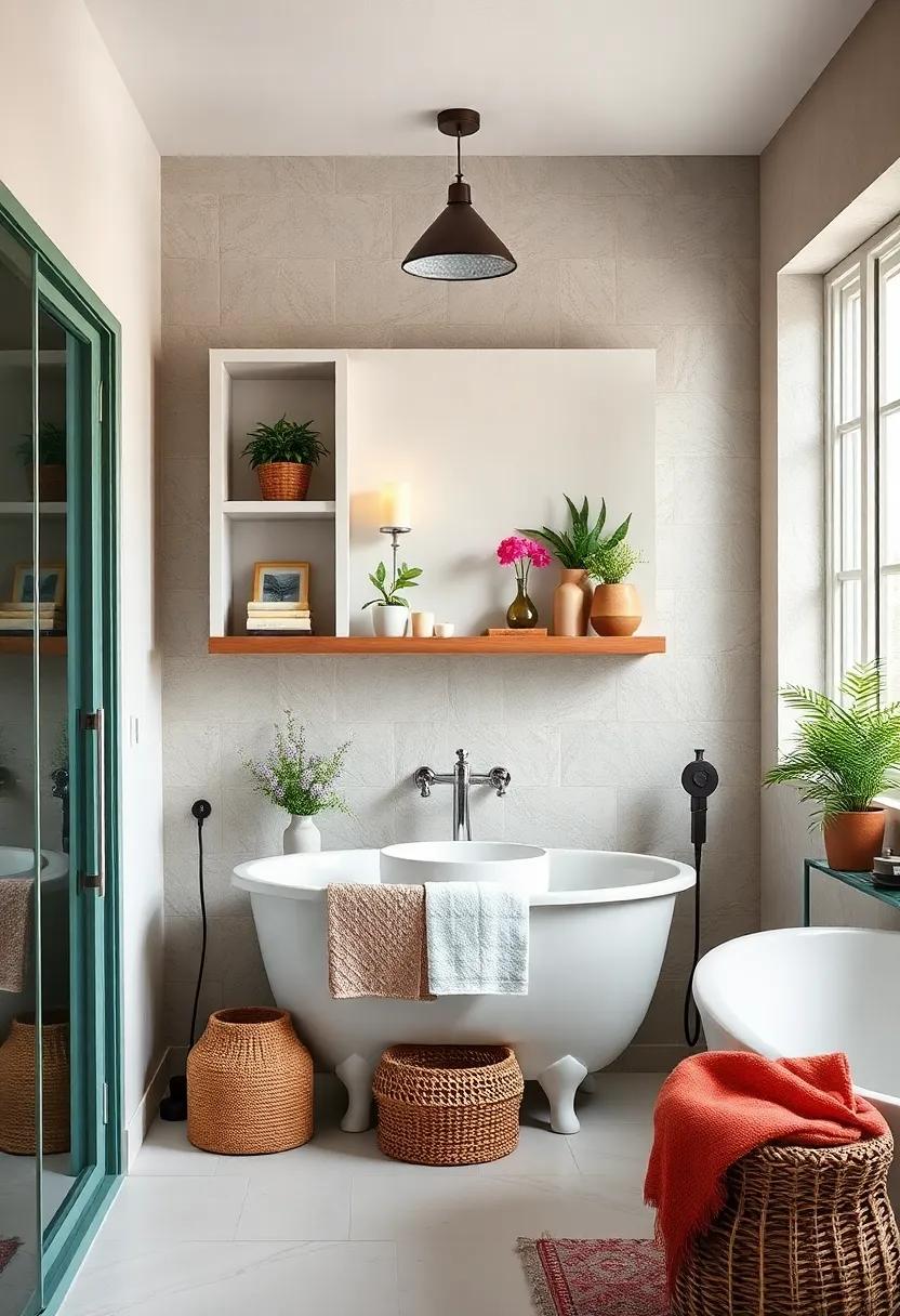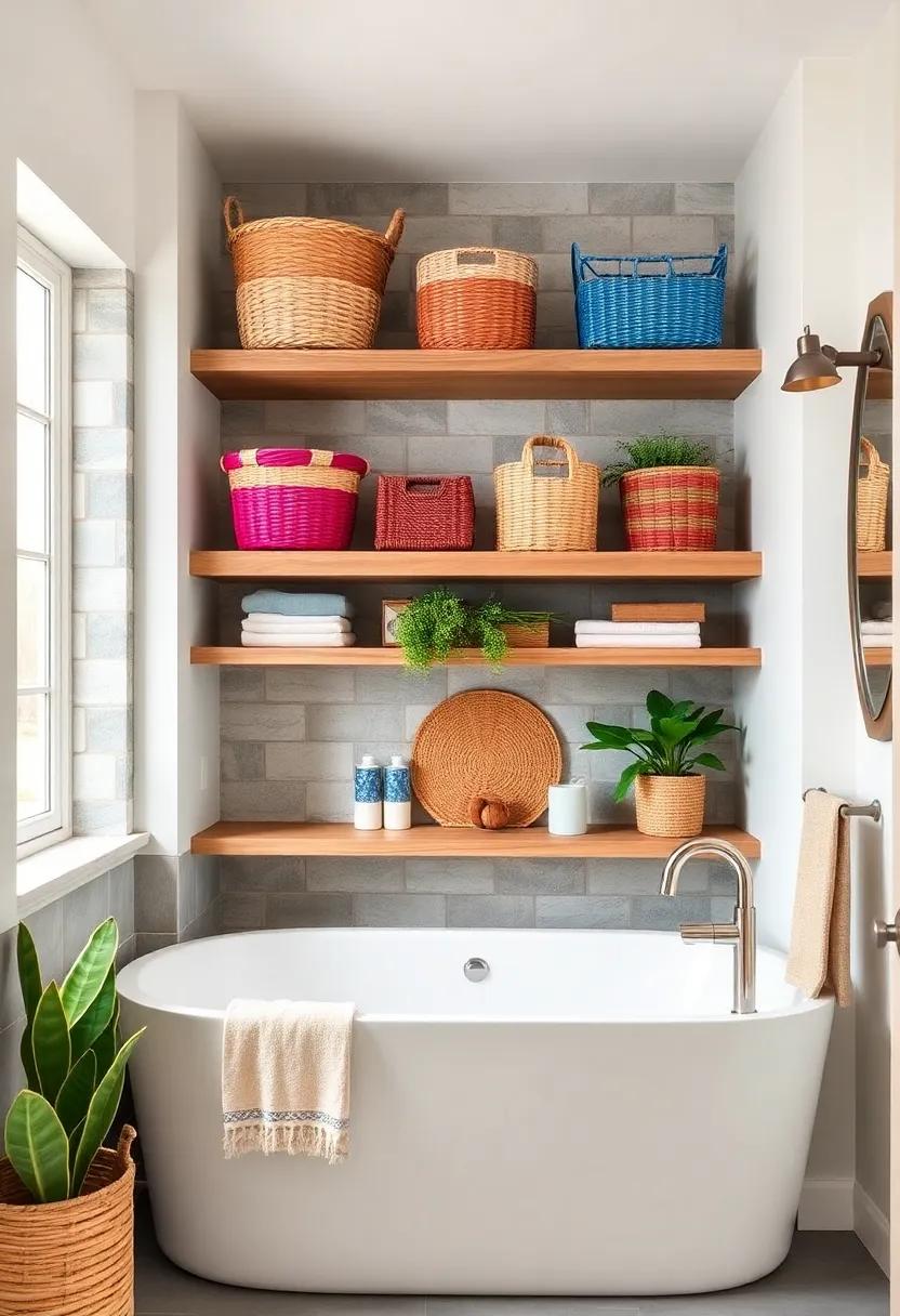 Colorful Basket Displays: Use colorful woven baskets on your shelves to store bathroom essentials while bringing in pops of color