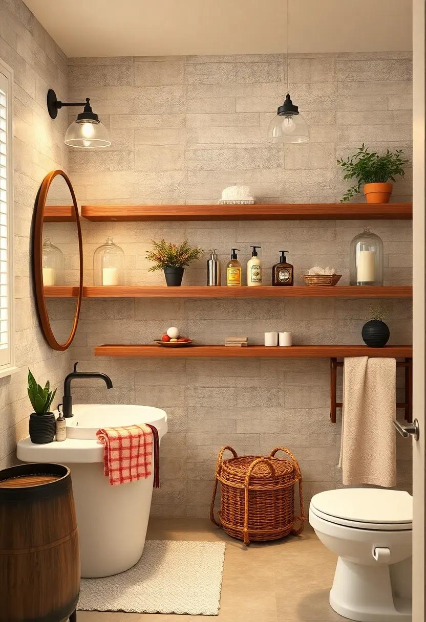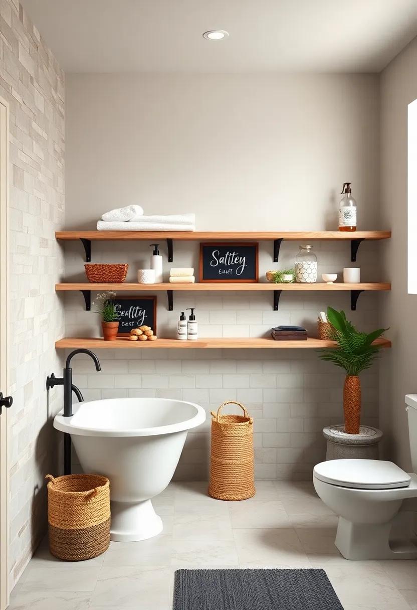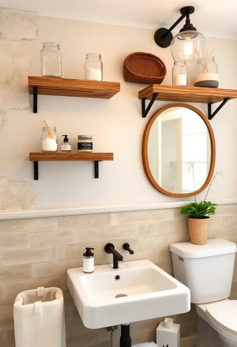 To elevate the design further, metal brackets or wooden mounts can be utilized to emphasize the simplicity of the shelves, offering a unique twist to typical farmhouse styling. Additionally, opt for light woods or painted finishes in soft neutrals to maintain coherence with the palette of a farmhouse bathroom. A carefully arranged display can include: