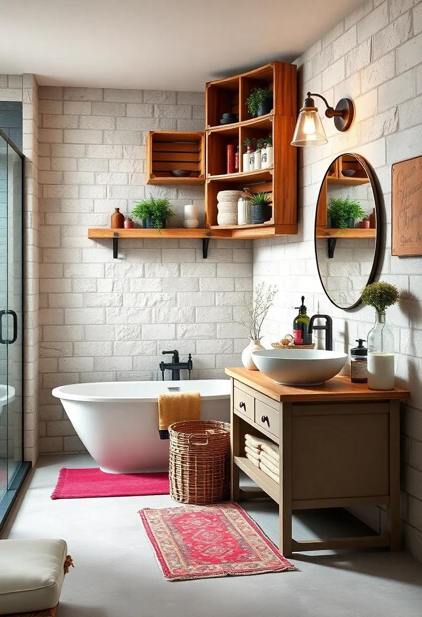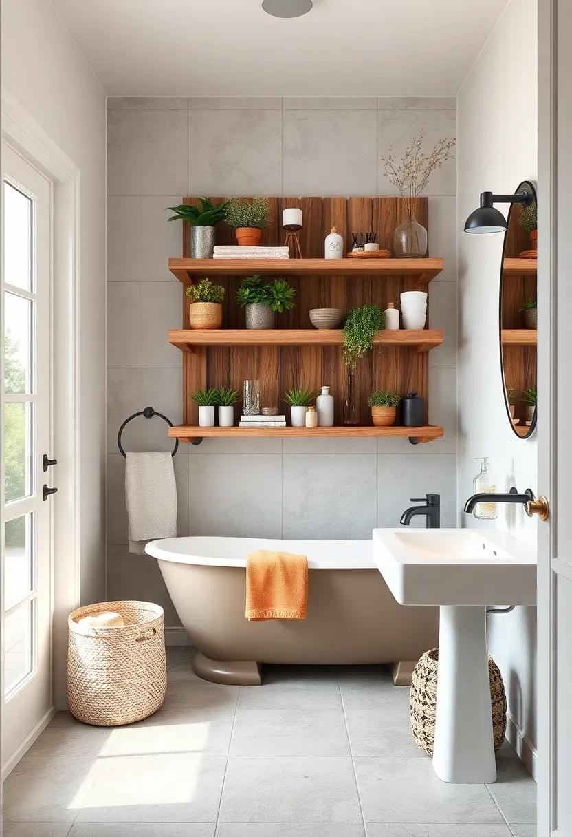 Pallet Shelves: Repurpose old pallets into rustic shelves that bring warmth and simplicity to your bathroom decor, perfect for displaying greenery or essential oils