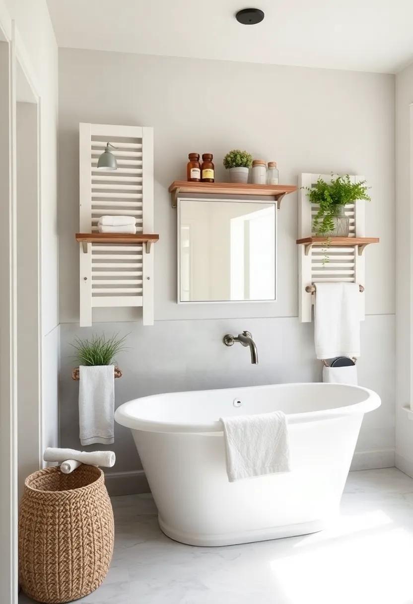 Painted Shutter Shelves: Old shutters can be turned into unique shelf units to hold essentials while adding visual interest to your farmhouse bathroom