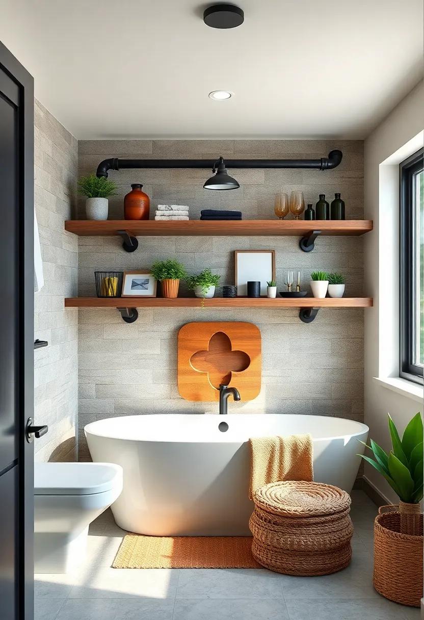 Reclaimed Wood Floating Shelf: A large, reclaimed wood floating shelf can offer a dramatic centerpiece for your bathroom wall, perfect for showcasing decorative items