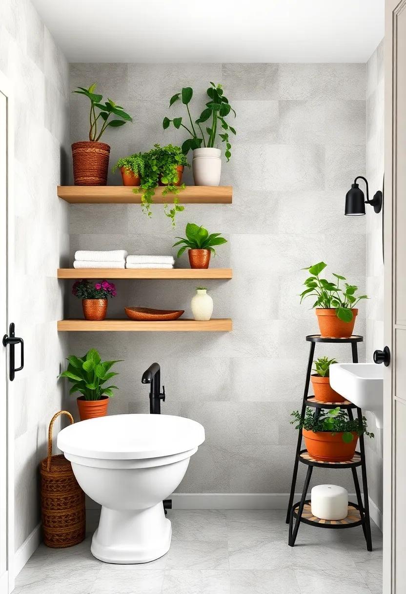 Tiered Plant Stand: A tiered stand works beautifully for displaying potted plants, injecting life and color into your bathroom space