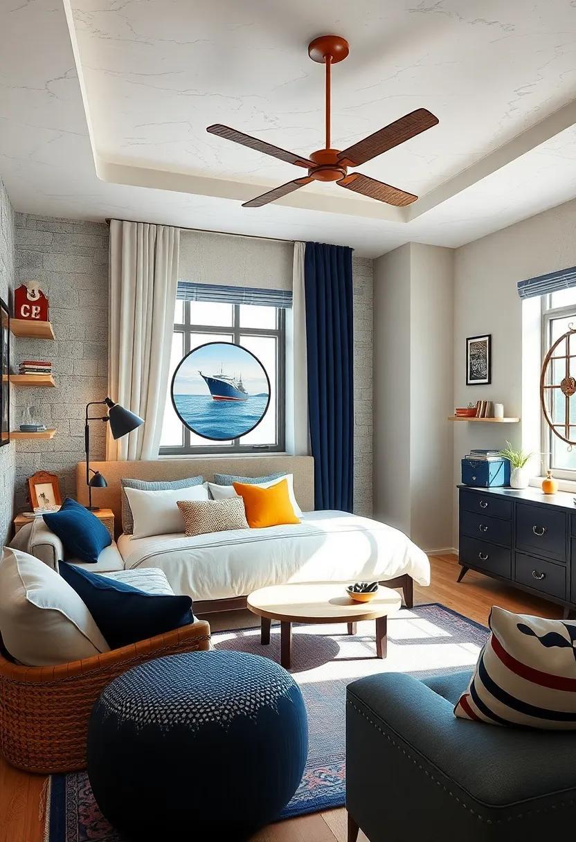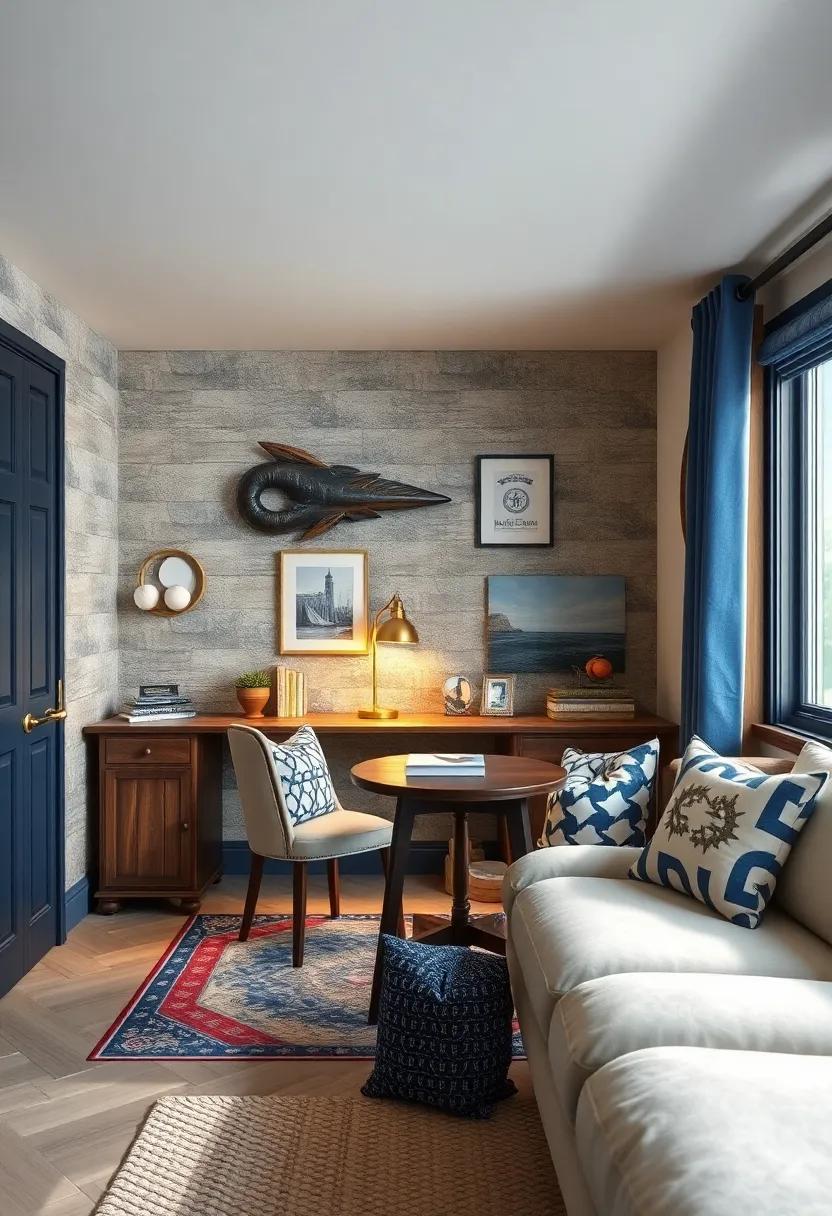 These choices not only provide warmth but also define the areas within the room, making it perfect for relaxation, study, or creative projects, all while remaining true to the nautical theme.