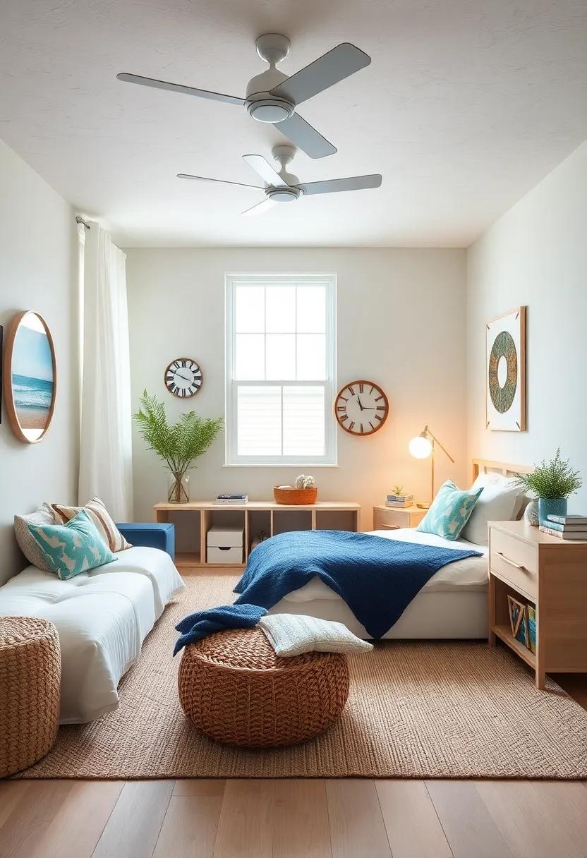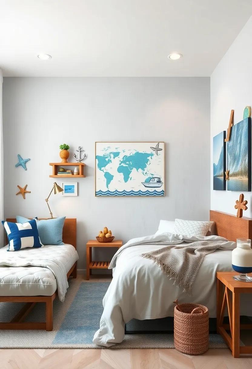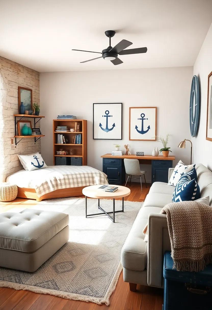 To further enhance the nautical theme, consider incorporating decorative items that echo the sea and sky. Incorporate stunning artwork featuring ocean scenes or sailboats to add character and personality to the room, positioned thoughtfully above the bed or a study desk. A rattan or driftwood furniture piece can tie in the texture reminiscent of beachside living. Additionally, a carefully chosen color palette can help define dedicated spaces within the room, allowing for a harmonious blend of work, rest, and play areas. simple yet stylish, this design approach nurtures a serene atmosphere that’s perfect for any teen who dreams of sailing adventures on endless horizons.