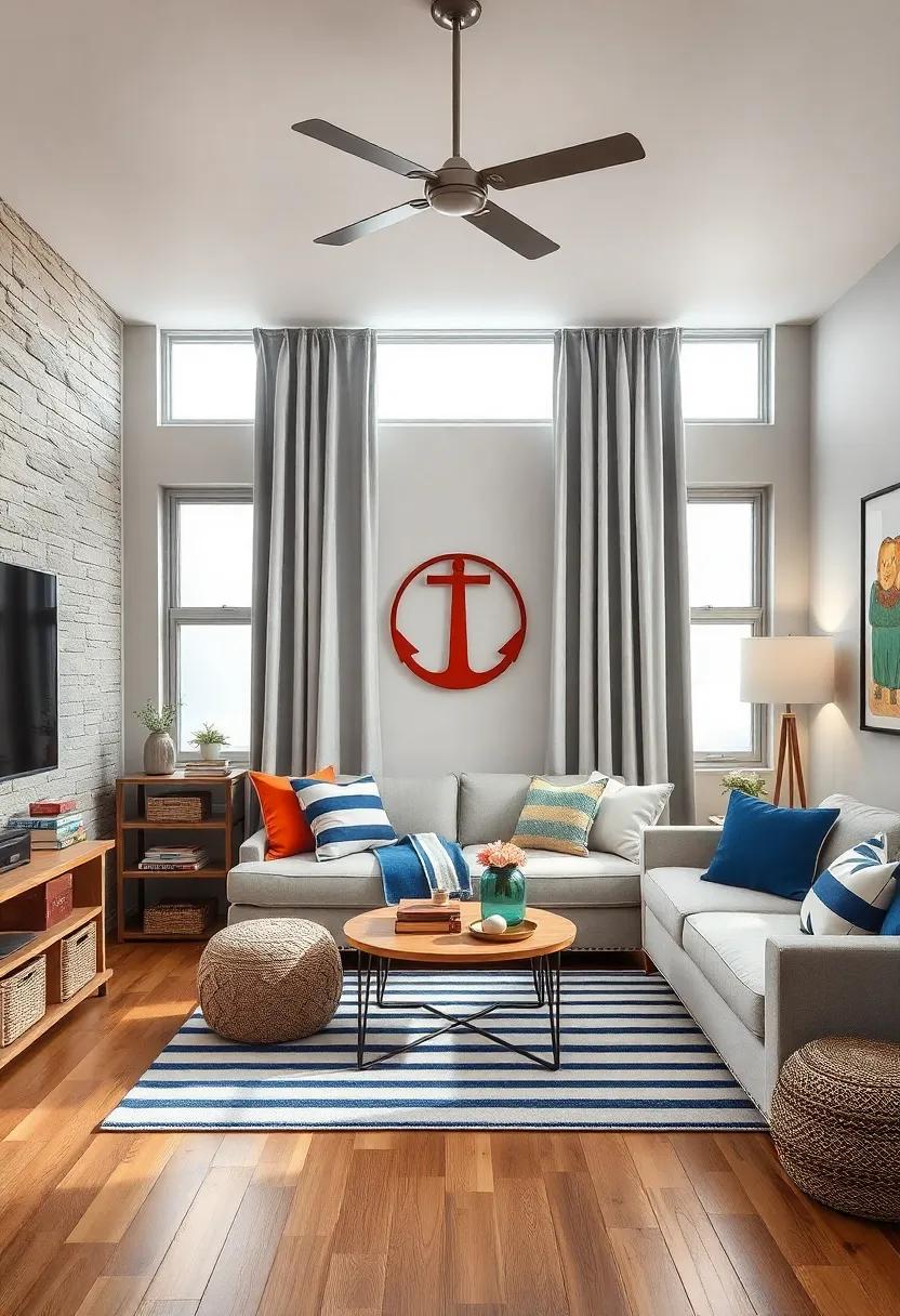 Anchors Aweigh Accessories: Use anchor motifs in throw pillows, rugs, and wall art to subtly reinforce the nautical theme without overwhelming the space