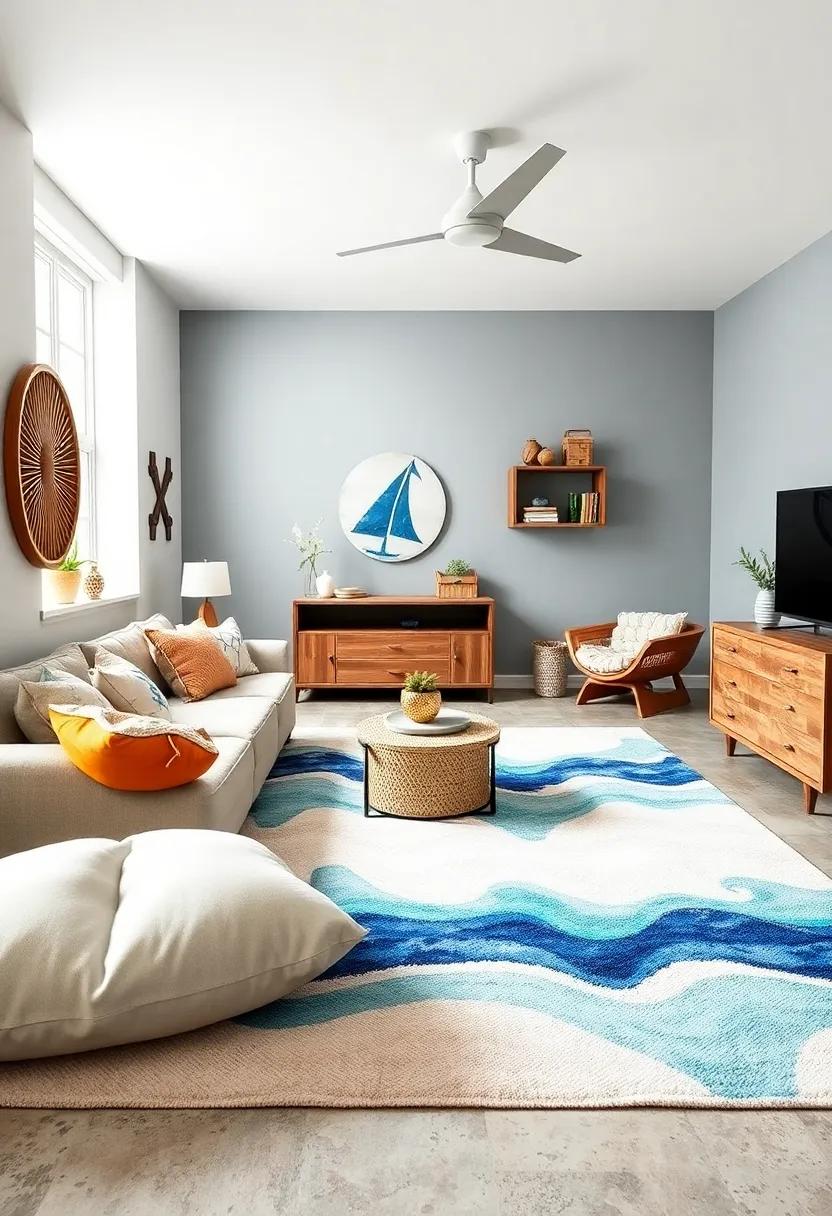 Beachy Rugs: Add plush area rugs in sandy hues or with ocean patterns, providing comfort and warmth while emphasizing the overall theme of the room
