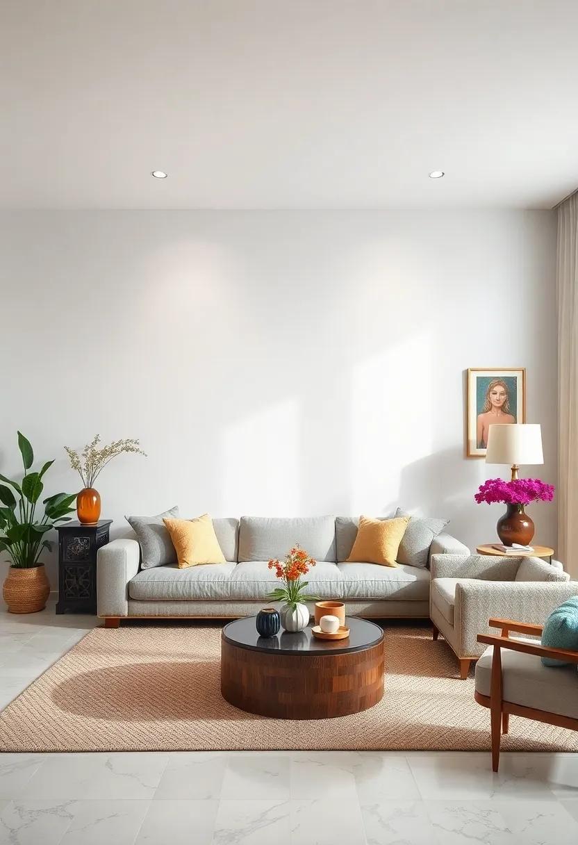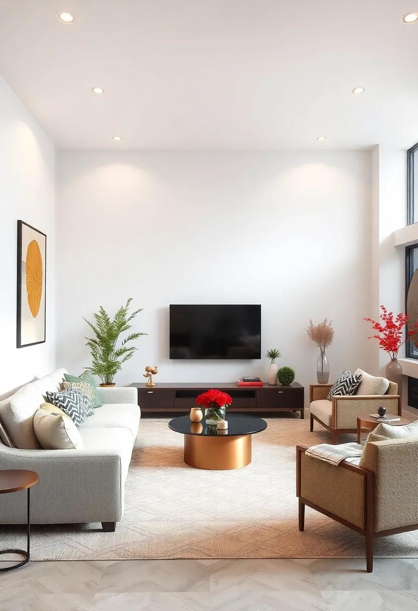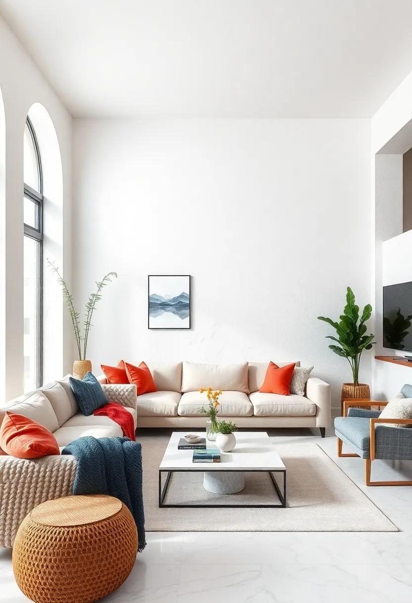One of the best ways to inject personality into a space dominated by white is by incorporating bold furniture pieces that leap off the walls. A statement couch in a lively color like emerald green, ruby red, or deep navy can completely transform the visual dynamics of your living room. Imagine how a strikingly vibrant sofa can create a stunning focal point against an immaculate backdrop, inviting guests to take a seat and enjoy the ambiance. Additionally, a coffee table with an eye-catching design and unique hue can ground the room, seamlessly merging aesthetics with functionality.