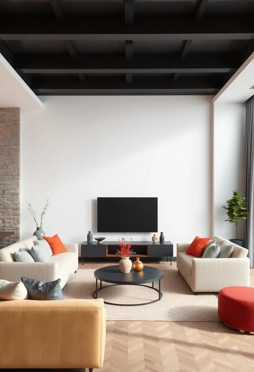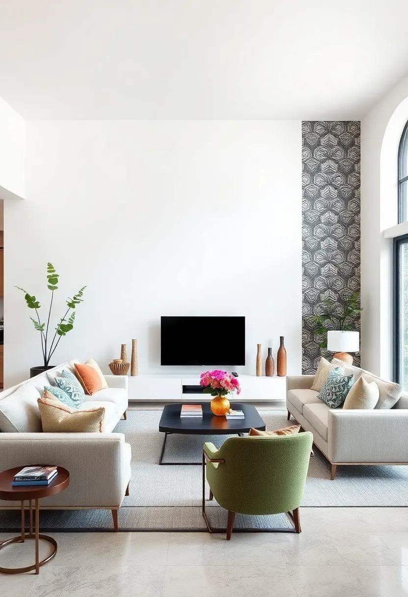 Transform your living room by creating a striking focal point on the white accent wall with a thoughtfully arranged entertainment area. Consider adding a sleek media console that not only houses your TV and other electronics but also serves as an aesthetic centerpiece. Choose a unit that complements the white backdrop while contrasting aesthetically—think dark woods or colorful finishes. Surround the console with decorative elements like books, potted plants, or stylish storage boxes, creating a balanced atmosphere of functionality and decor.