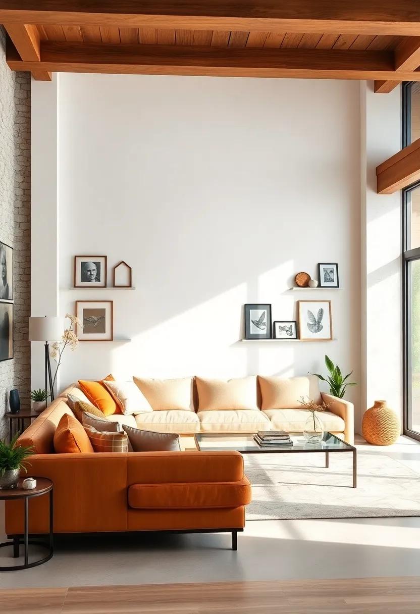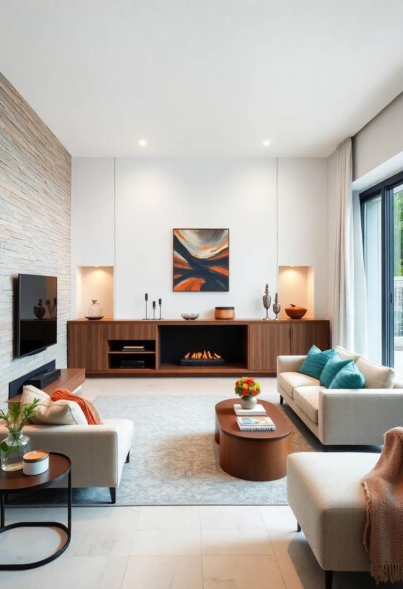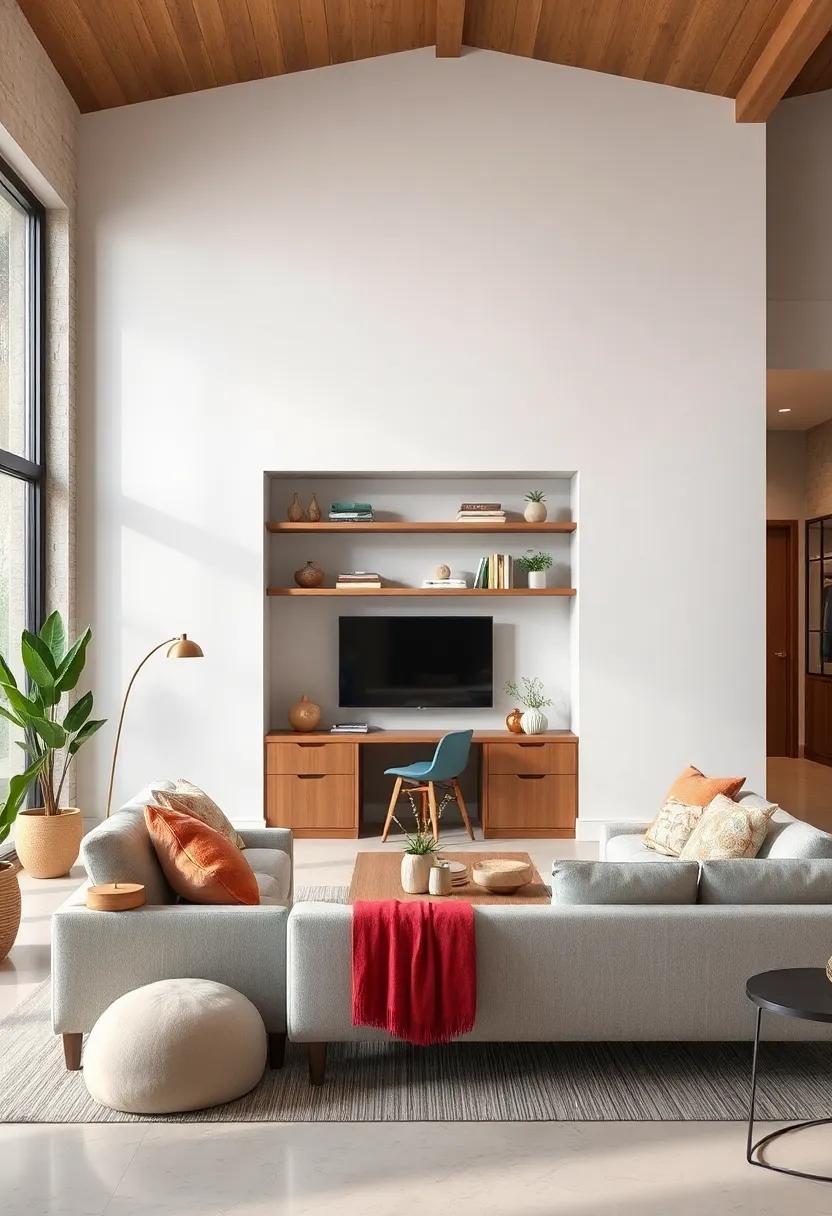 Creating a harmonious living space is all about blending style with utility. Integrate elegant cabinetry that complements your white accent wall, allowing it to be a canvas for your personal style. Consider built-in shelves or media cabinets that not only offer ample storage for books and decor but also serve as eye-catching displays. This approach helps maintain an airy feel while enriching the overall aesthetic of the room.