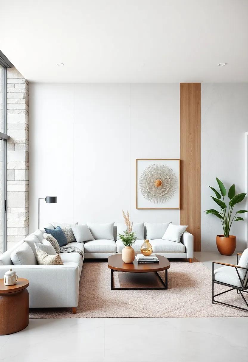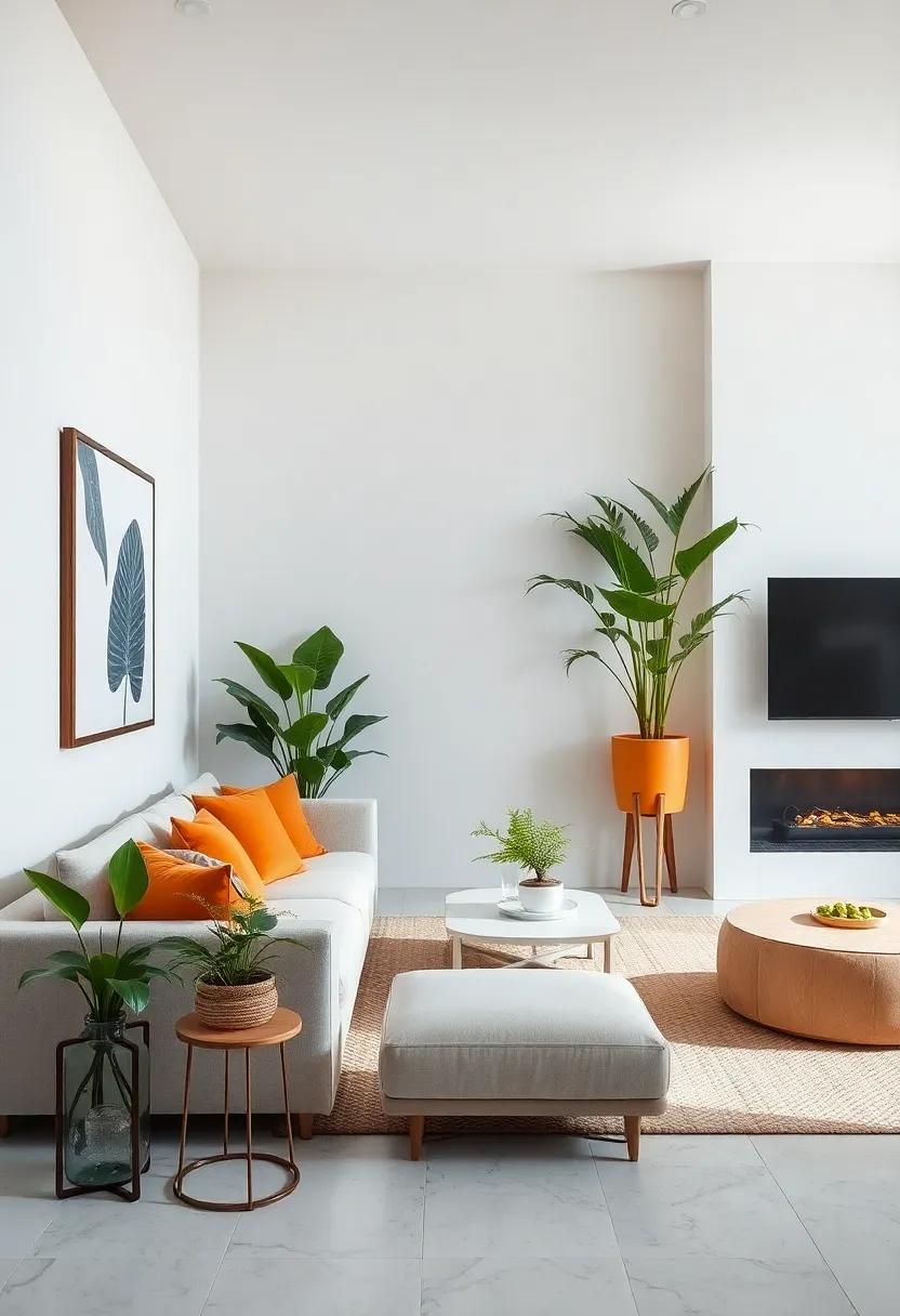 Bringing the outdoors in is a fantastic way to enliven a living room featuring a clean white accent wall. Incorporating indoor plants adds a splash of color and texture, creating a striking contrast that enriches the entire space. Consider potted plants at various heights for visual interest. Fiddle Leaf Figs and Rubber Plants might be excellent tall additions, while Pothos and succulents can nestle comfortably on shelves or coffee tables. By creating a dedicated green corner or layering plants on different levels, you can turn a minimalist space into a cozy, vibrant sanctuary.