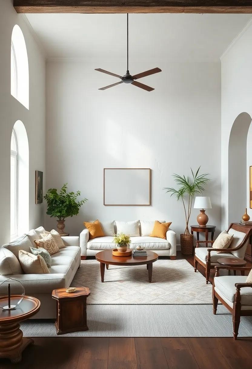 To further enhance the eclectic vibe, accessorize with antique decor such as vintage vases, sculptures, or framed botanical prints. These items can bridge the gap between old and new, coupling the freshness of white paint with the depth of history represented in vintage pieces. Incorporate a few antique textiles, like a faded persian rug or embroidered cushions, to soften the starkness of the modern elements. This thoughtful blend will transform your living room into a curated space where each piece contributes to a coherent yet diverse aesthetic.