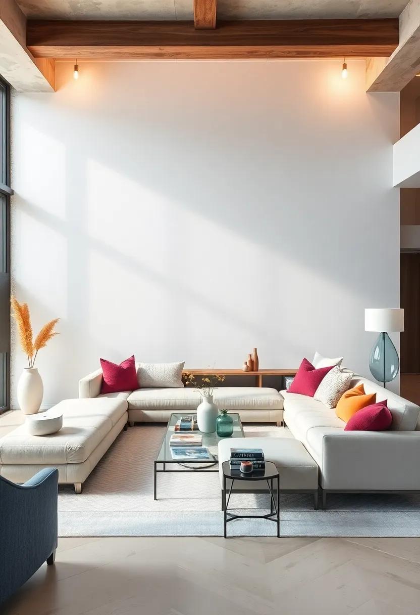 Use Bold Furniture: Select a statement couch or coffee table in a vibrant hue to contrast beautifully with your white background