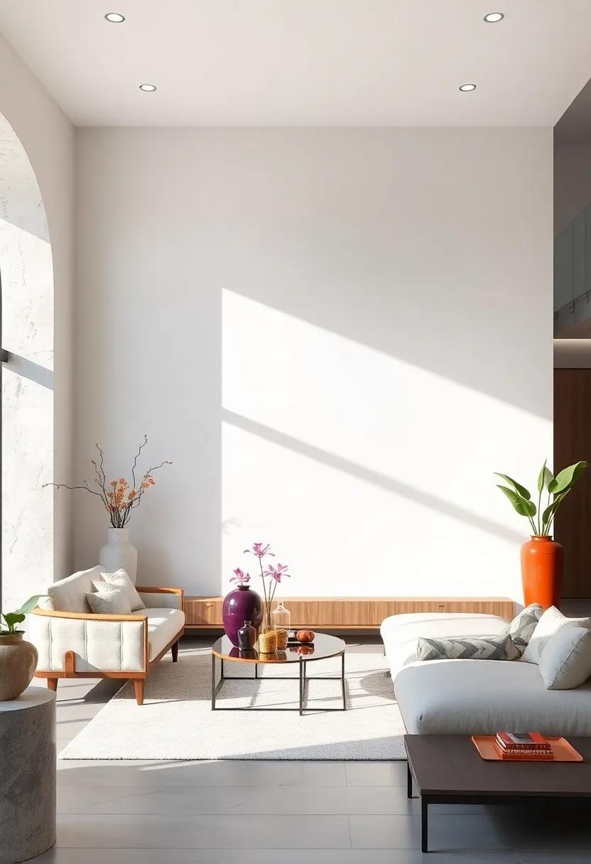 Use Bold Accessories: Incorporate colorful vases, sculptures, or decorative items that contrast strikingly against the pristine white wall