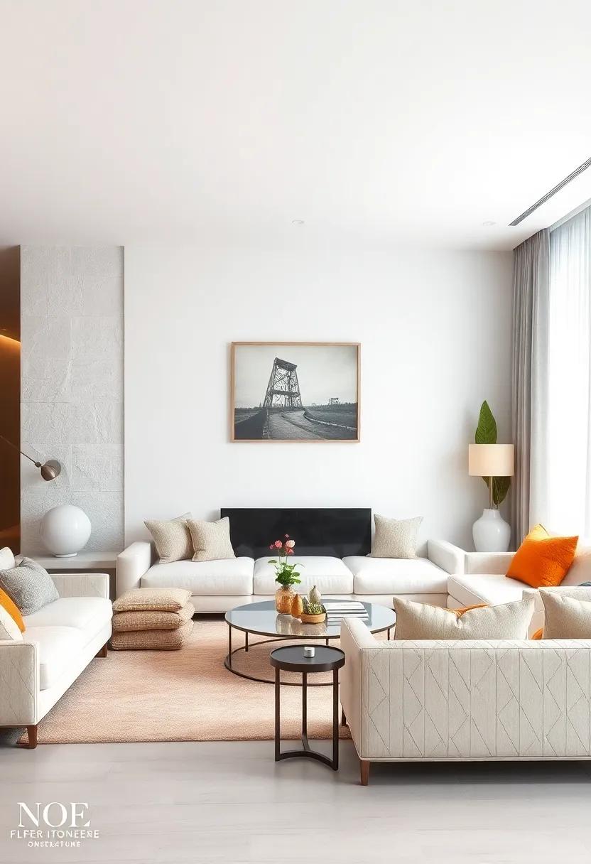 Layering metallic elements throughout the room adds an inviting warmth that balances the coolness of a predominantly white palette. You can mix various metallic finishes for a curated, eclectic look or opt for a monochromatic scheme for a more cohesive vibe. Consider using lamp fixtures with metallic finishes or a coffee table with a sleek metal base. Accent your living room with a stunning piece such as a side table or decorative bowl made of hammered metal, which not only creates texture but also draws attention. A well-placed mirror with a metallic frame can reflect light and create a sense of spaciousness, amplifying the impact of your elegant decor choices.