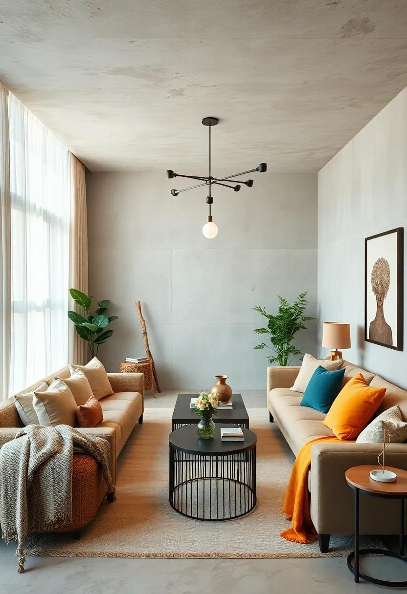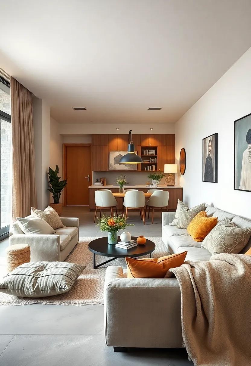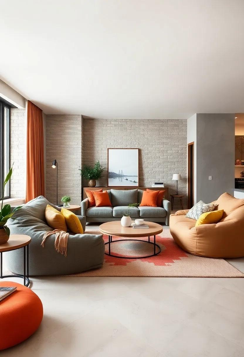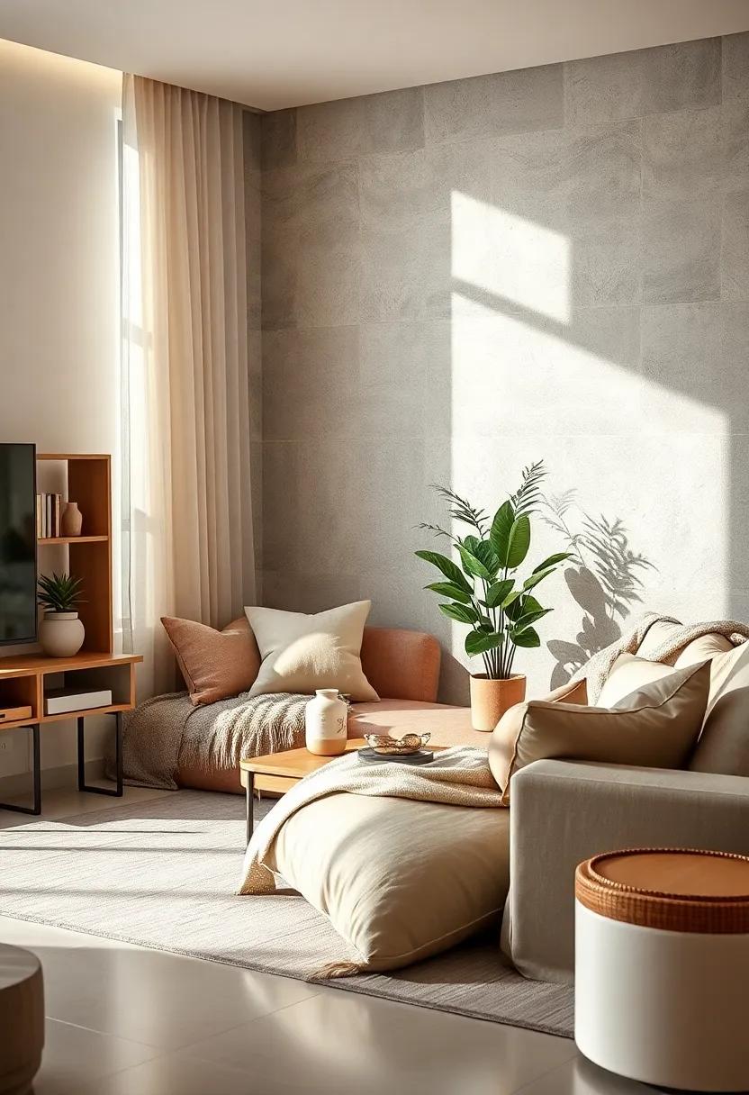 Transform your living room into a cozy haven with oversized floor cushions that invite relaxation and casual socializing. These large, soft cushions not only provide a comfortable seating option but also add a splash of color and texture to your space. Imagine a relaxed gathering where friends can sprawl out on vibrant cushions, creating an informal and welcoming atmosphere. Pair them with textured throws and soft blankets to elevate the overall comfort and design aesthetic. Consider cushions in varied shapes and sizes to provide visual interest and a playful vibe.