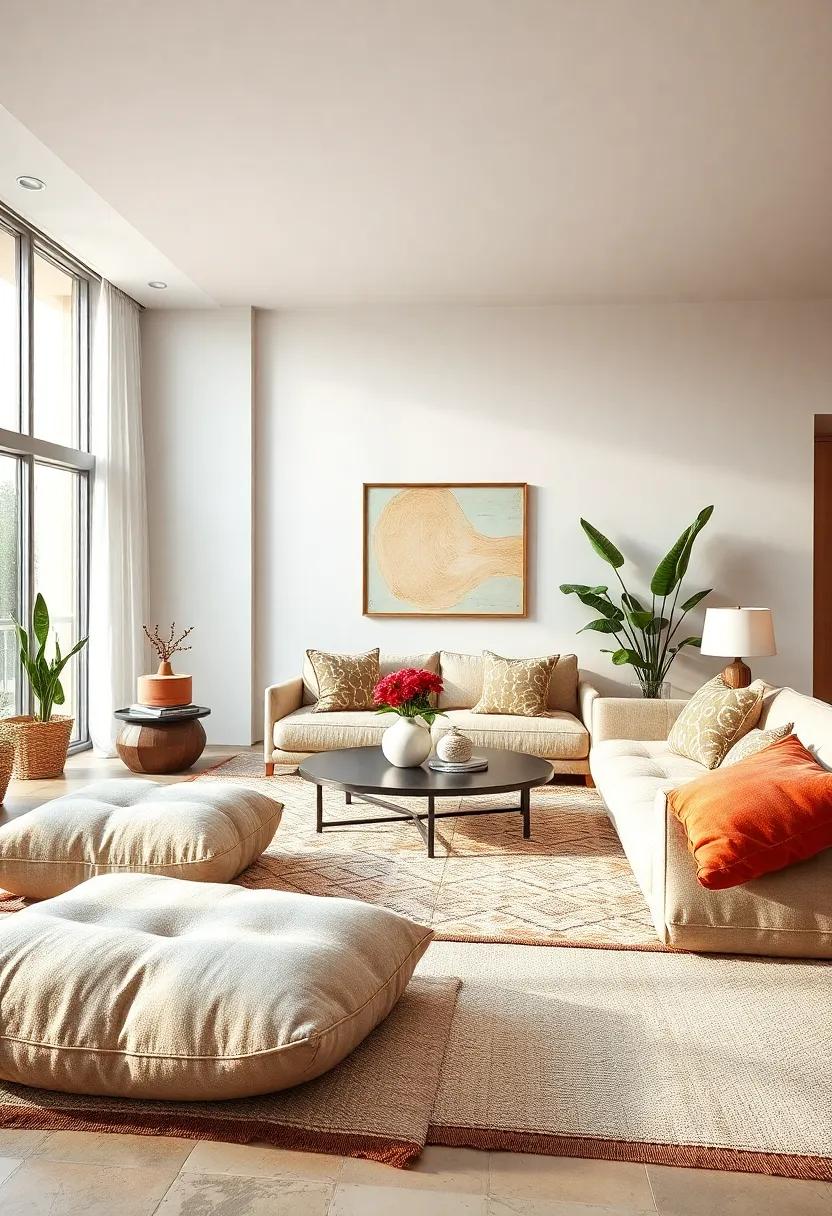 Oversized Floor Cushions: Use large, soft floor cushions for casual seating and a laid-back vibe perfect for gatherings