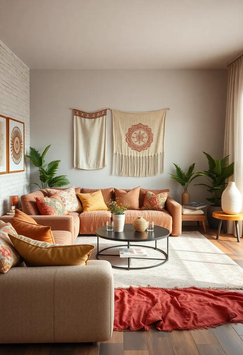 To make a statement with your wall decor, think about creating a gallery wall that features a mix of sizes and textures. Frame smaller fabric art or layer multiple tapestries to create visual interest. Use natural hues or pastel shades that resonate with the overall color palette of your room to maintain cohesion. Additionally, you can play with the arrangement by using floating shelves to hold smaller pieces alongside textured wall art. This integration not only adds dimension but also encourages personalization, allowing your living room to feel like an inviting retreat.