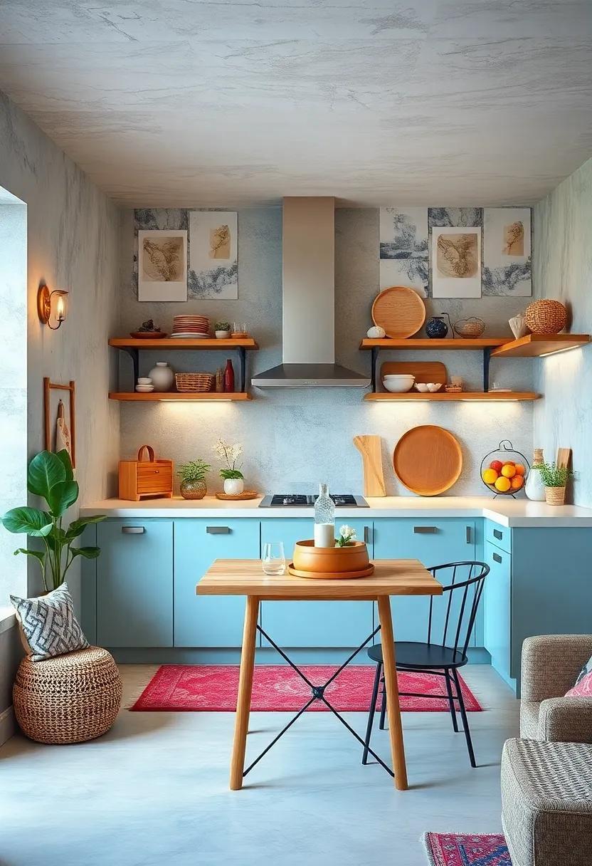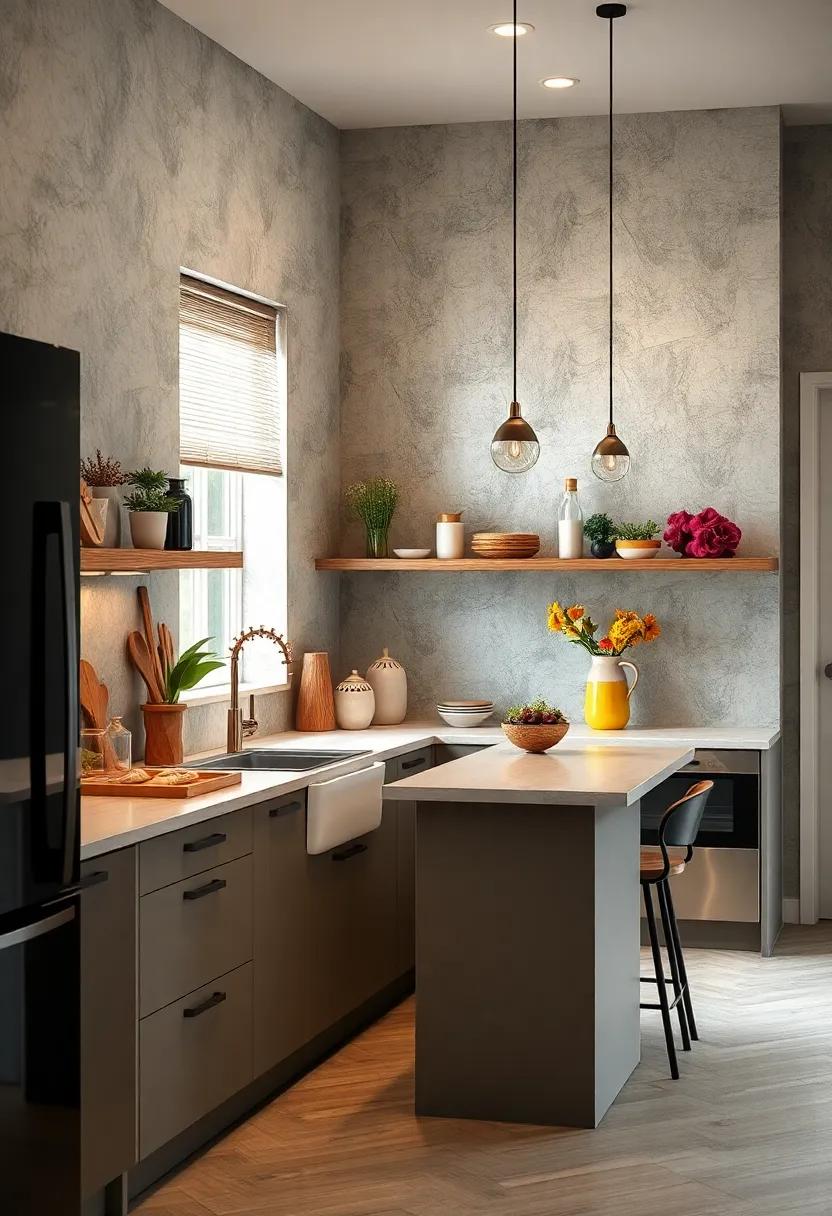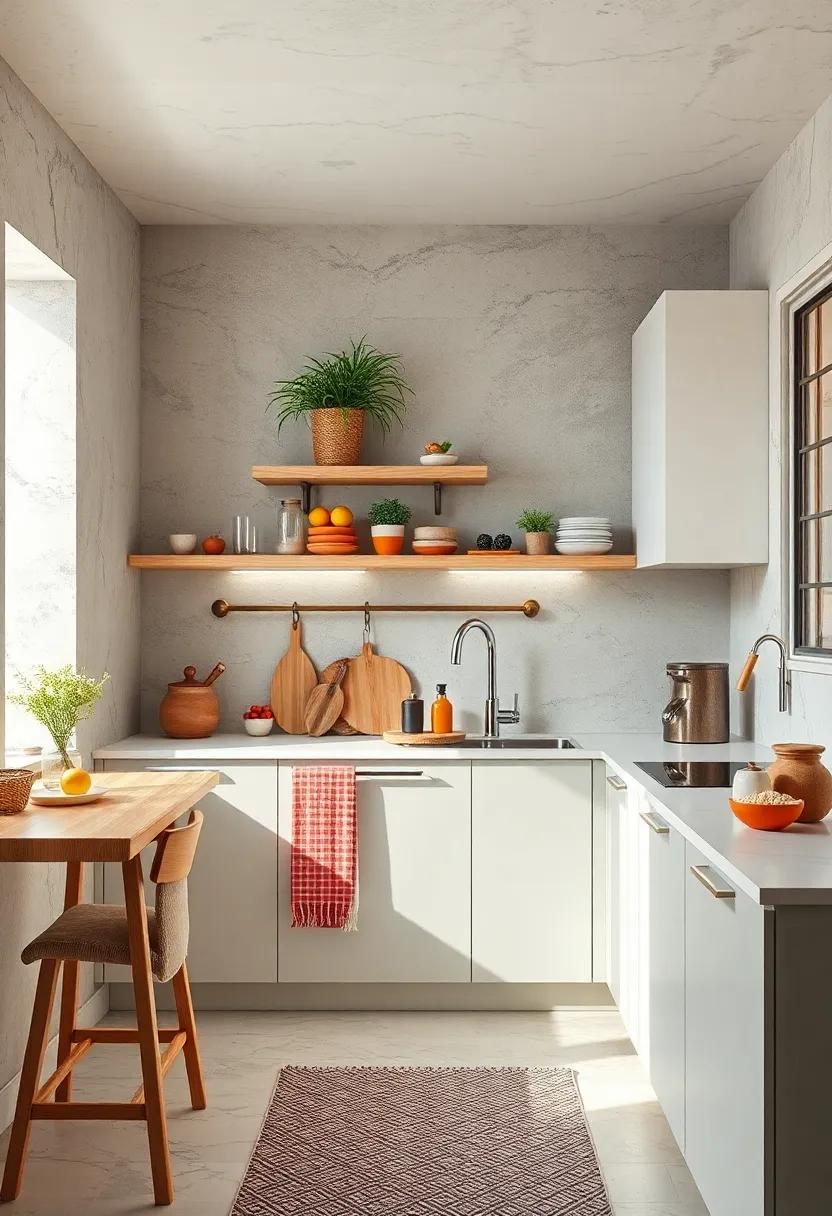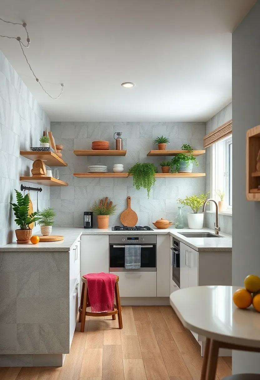 Transform your small kitchen into a spacious haven by taking advantage of the vertical dimension. Wall-mounted shelves and cabinets not only free up valuable counter space but also become a stunning display for your culinary essentials. Incorporate floating shelves to showcase your most colorful dishes, cookbooks, or even a small herb garden, creating a lively visual interest while maintaining functionality. It’s the perfect way to inject personality into your kitchen without sacrificing space.