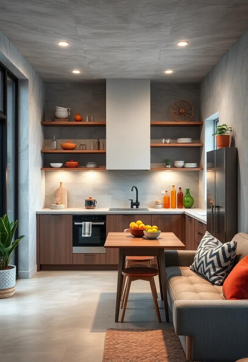 fold-Down Tables: Consider a wall-mounted fold-down table that can be used for dining or extra prep space when needed, then tucked away when not in use