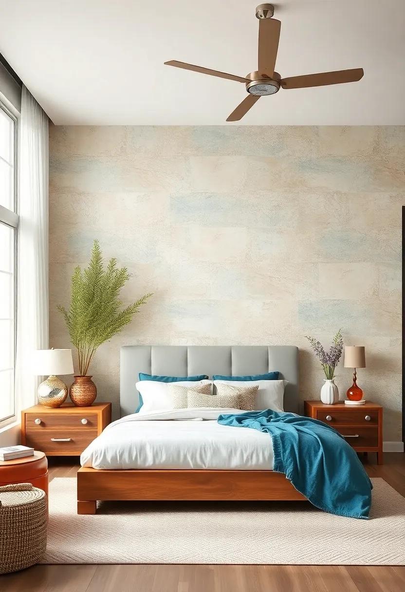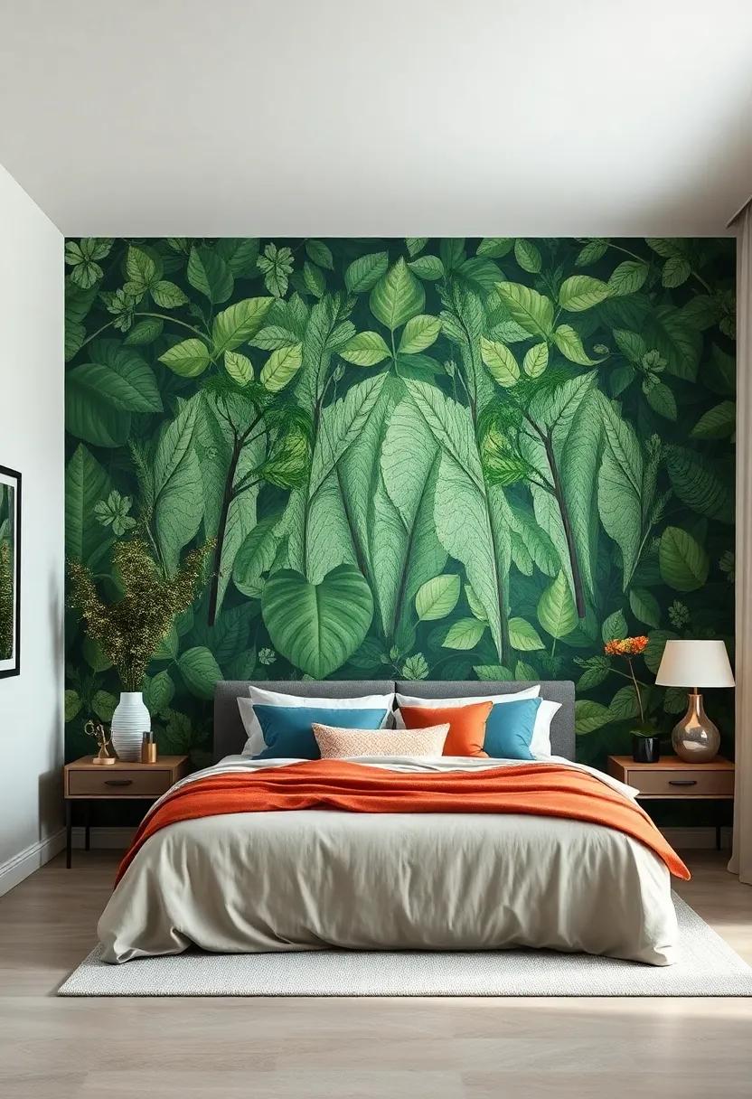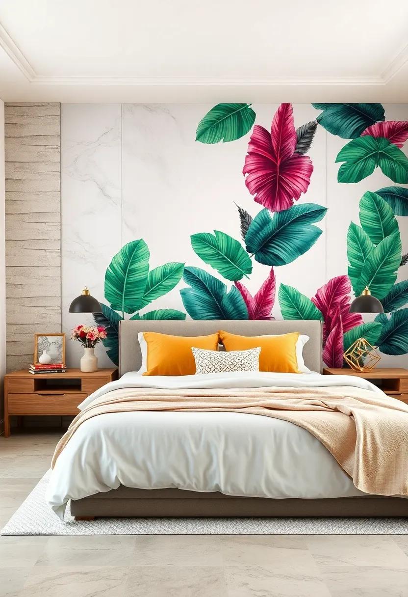 Tropical Prints: Enhance your space with a bold accent wall featuring large tropical leaf prints, transforming your bedroom into a vibrant getaway