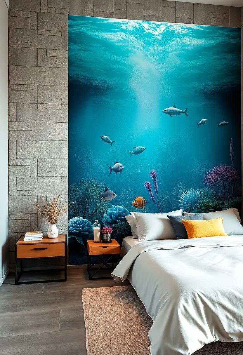 Underwater Wonders: Dive into a soothing ambiance with an underwater-themed accent wall that plays with shades of teal and marine life motifs
