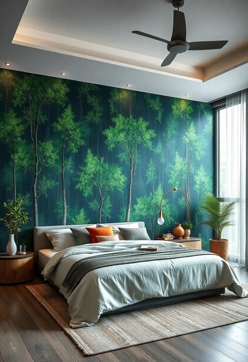Tranquil Forest Vibes: Embrace the serenity of a lush forest with a deep green accent wall adorned with botanical prints or leaf motifs