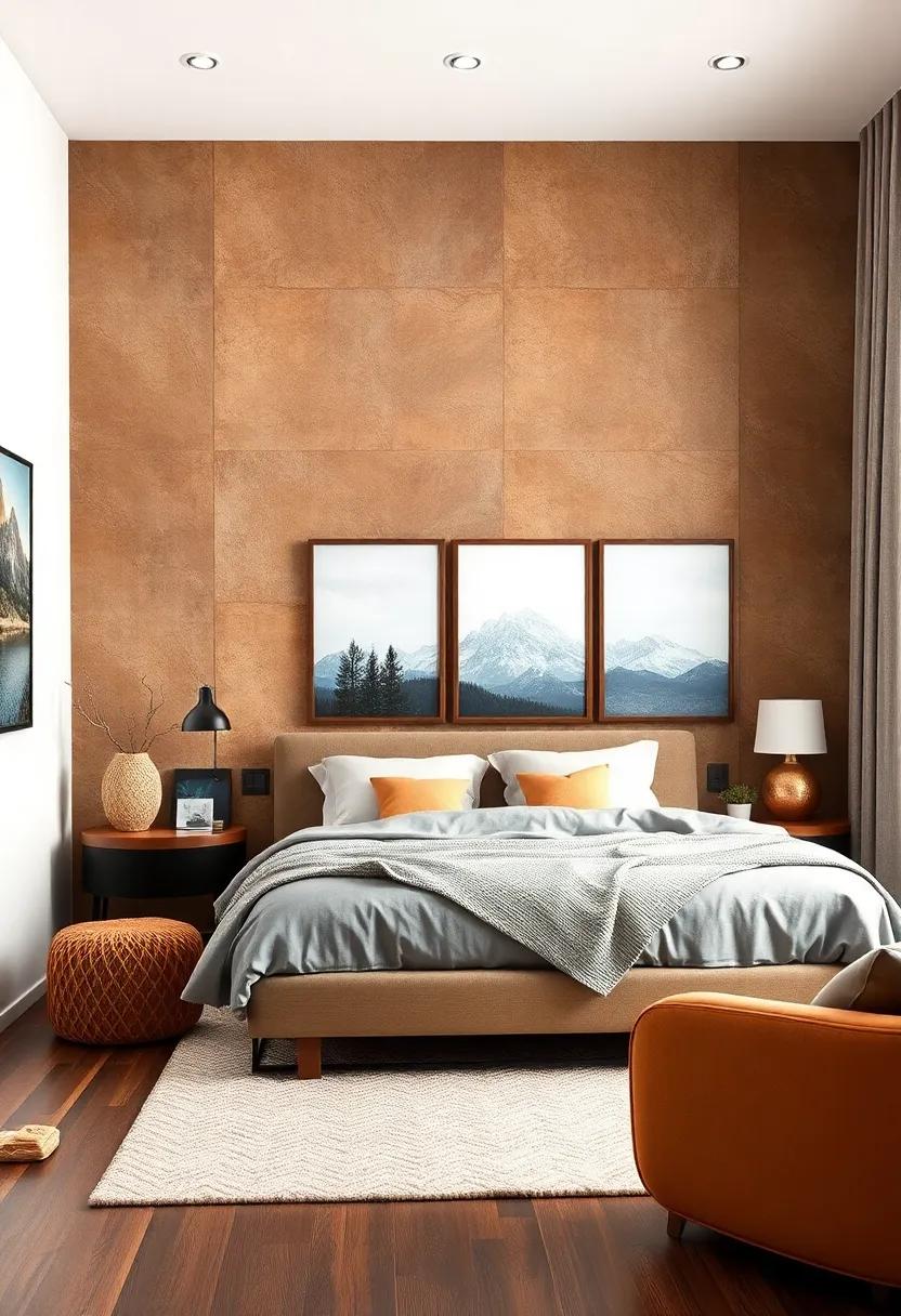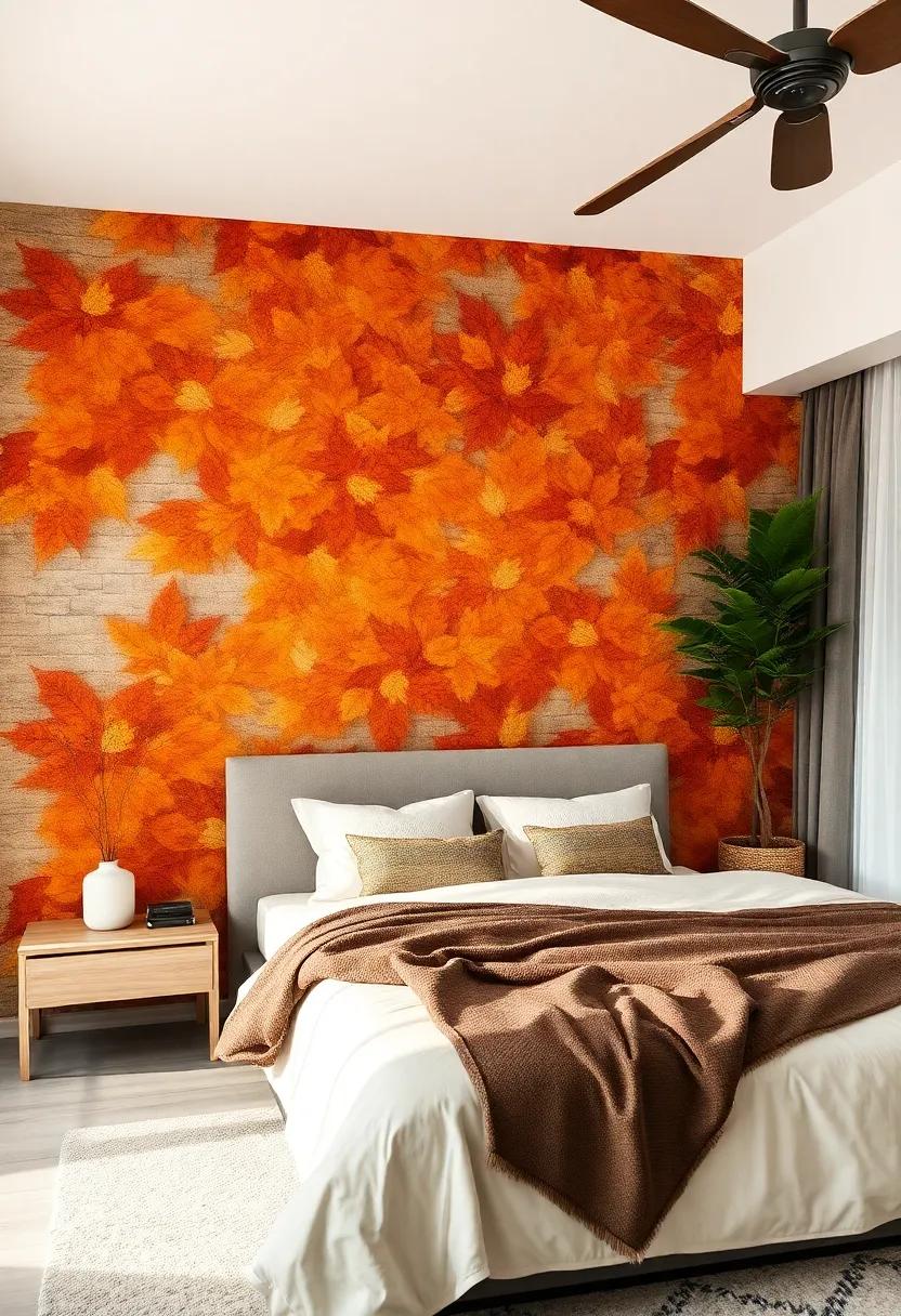 Transform your sleeping space into a serene autumn oasis by embracing a burnt sienna accent wall that echoes the warm, earthy tones of fall.This rich hue not only brings depth to your room but also creates a cozy atmosphere reminiscent of fallen leaves crunching underfoot. To enhance the seasonal theme, consider decorating with leaf patterns or framed artwork that captures the essence of autumn foliage. Think stylized prints featuring vibrant reds, deep oranges, and sunny yellows that contrast beautifully with the warm backdrop.You can also explore textured materials such as a fabric wall hanging that mimics the delicate intricacies of leaves, adding an extra layer of visual interest to your space.