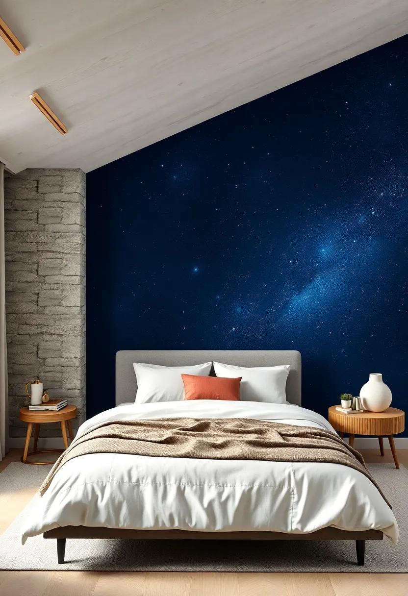 Celestial Sky: Drape your walls in a deep navy blue, reminiscent of the night sky, accented with shimmering stars for a soothing, cosmic touch