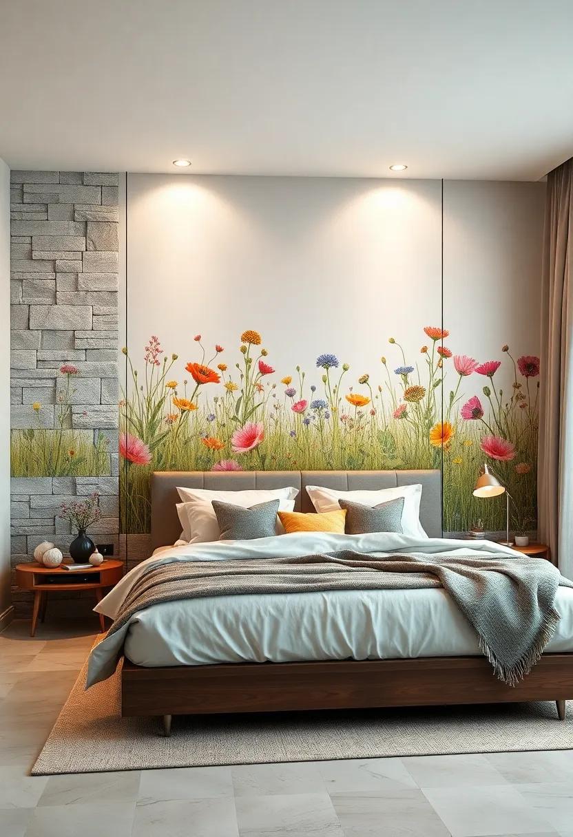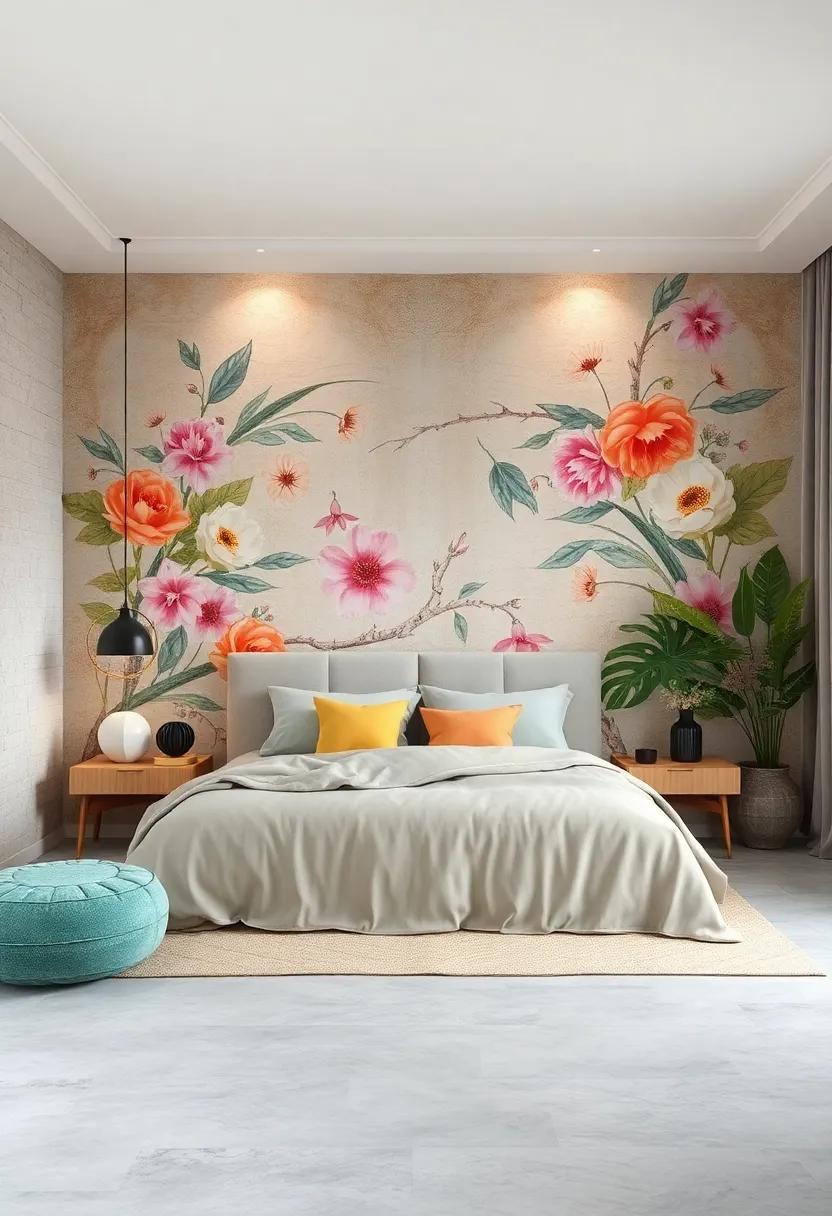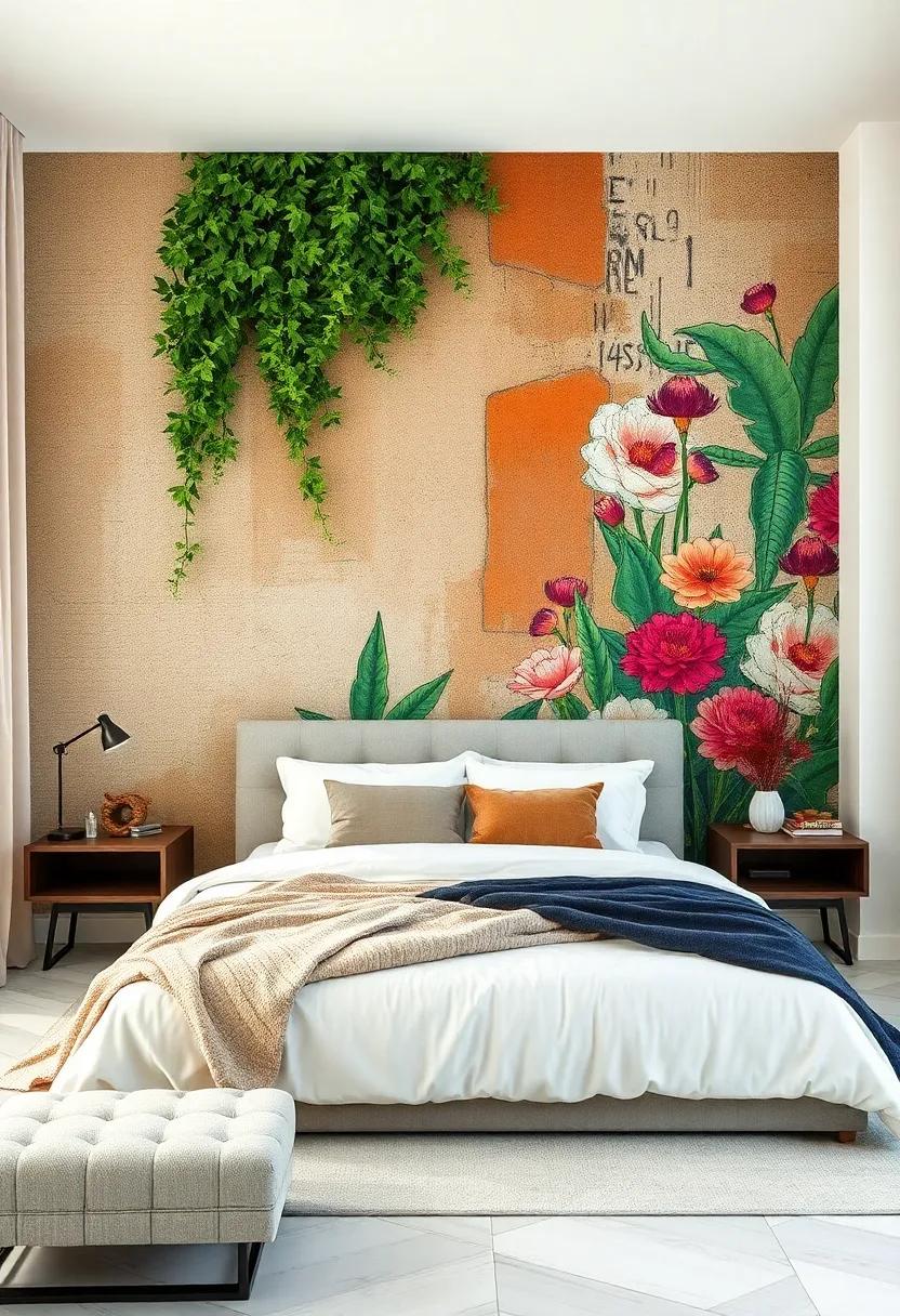 Transform your bedroom into an urban oasis by incorporating a vibrant mural that blends the hustle of city living with the tranquil charm of floral elements. Imagine walking into a space where bold street art meets lush blossoms, creating an energizing yet calming atmosphere. Layers of color—from graffiti greens and yellows to purples and reds—can be splashed across an accent wall, intertwining with painted vines or realistic flower motifs. This innovative fusion not only reflects a love for city life but also speaks to the beauty of nature, giving your bedroom a unique character that deviates from the mundane.
