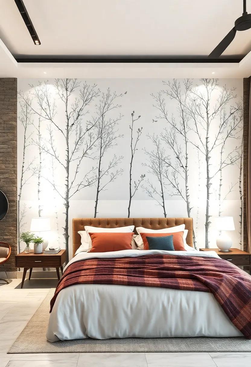 Birch Tree Serenity: Channel the peacefulness of a birch grove with a soft white wall featuring delicate gray tree silhouettes that unify the design