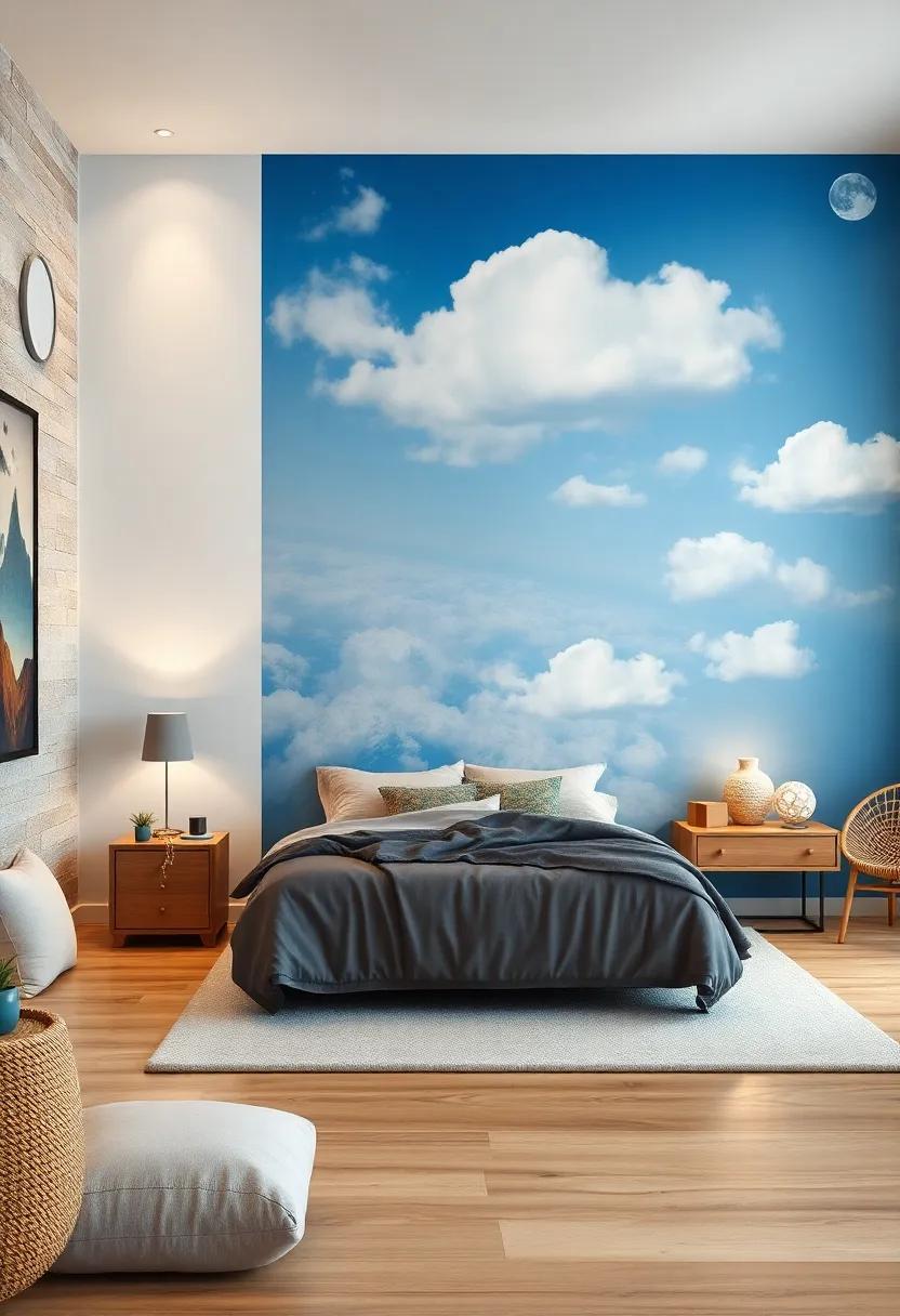 To further enhance your sky-themed sanctuary, consider adding star-themed accents that twinkle in the ethereal blue backdrop. LED star lights strung along the ceiling create a magical effect, simulating a starry night within the comfort of your own room. For an interactive element, a glow-in-the-dark wall sticker constellation can encourage a sense of wonder while doubling as a playful element for children. Pair these accents with minimalist furniture in white or natural wood tones to maintain a soft, airy feel, allowing the blue to resonate as the main focus of your tranquil space.