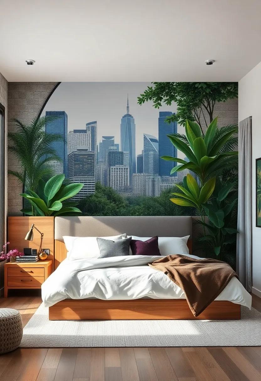 Urban Jungle: Create a modern twist on nature with a mural featuring city landscapes intertwined with greenery, bridging the outdoors with urban life