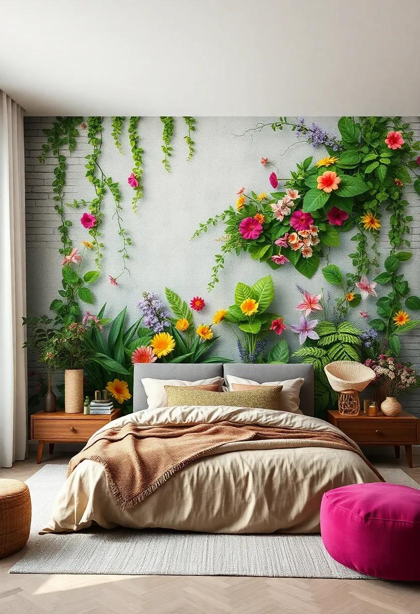 transform your bedroom into a serene retreat by embracing the natural beauty of cascading vines and vibrant blooms. Imagine a mural that bursts with life, where lush greenery intertwines with radiant flowers in a colorful symphony. The organic shapes and detailed textures of the vines create an enchanting backdrop, inviting the calming essence of the outdoors into your personal sanctuary.Layering different shades of green and peppering in bold floral hues not only brings depth to the wall but also makes a striking statement that can elevate the entire room’s aura.