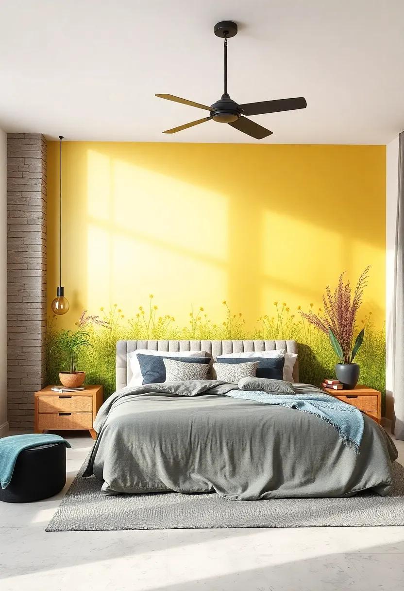 Transform your bedroom into a vibrant sunlit sanctuary with a bright yellow accent wall that echoes the cheerful hues of a summer meadow. This sunny shade can infuse your space with an uplifting energy, making it the perfect backdrop for relaxation and rejuvenation. To enhance the atmosphere, consider pairing this radiant wall with decor items that celebrate nature, such as: