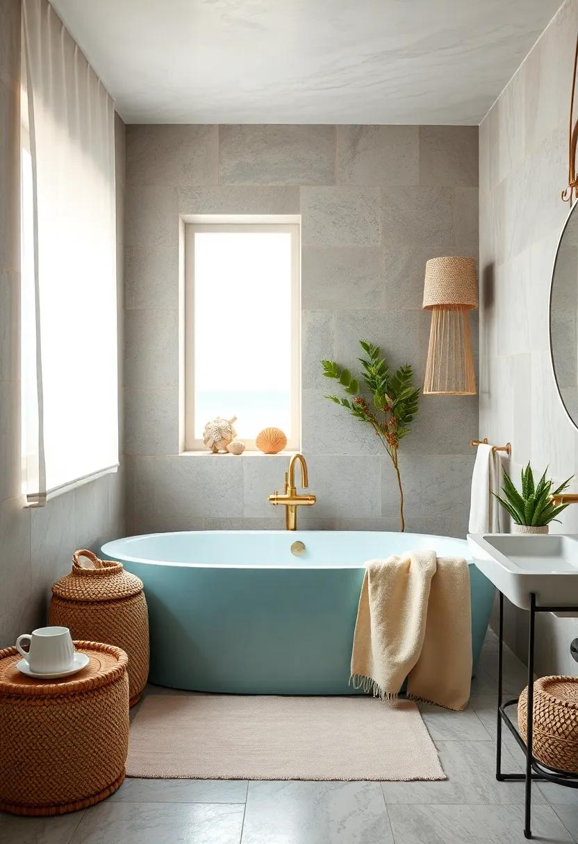 Immerse yourself in a tranquil oasis reminiscent of seaside retreats by selecting a soft blue soaking tub that echoes the hues of the serene ocean. This soothing color palette not only promotes relaxation but also invites a gentle coastal ambience into your bathroom.Surround your tub with a variety of seashell accents—coupled with driftwood-inspired decor elements—to create a harmonious balance between elegance and nature. Incorporate airy fabrics, such as sheer curtains or lightweight throws, to filter sunlight and enhance the feeling of being in a breezy beach house. The combination of these elements breathes life into your bathroom, making each soak feel like a mini-vacation.