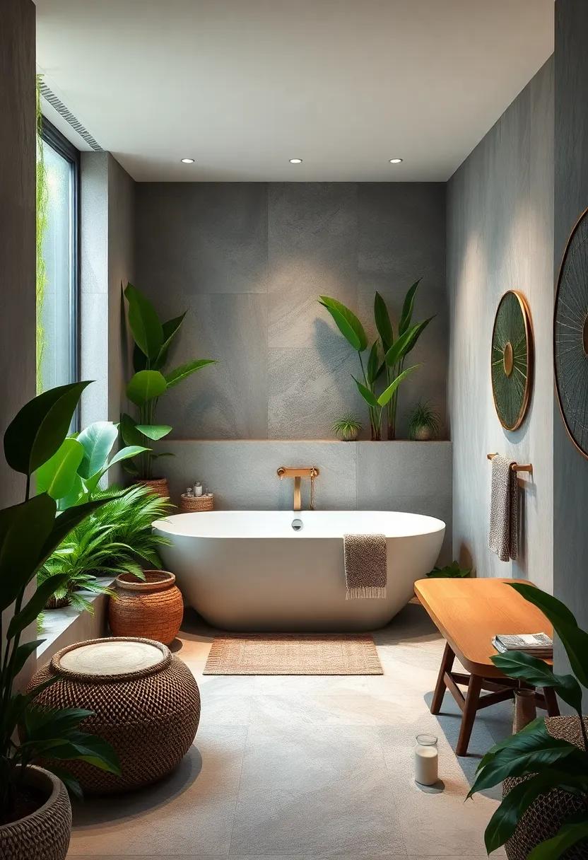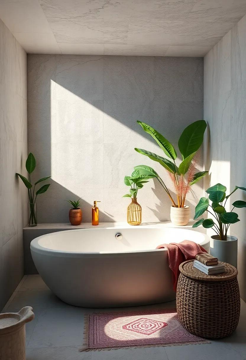 Imagine stepping into a sunlit sanctuary where tranquility embraces you the moment you enter. A deep soaking tub, positioned just right to capture the gentle rays of the sun, invites you to unwind and melt away the stresses of the day. To enhance this serene escape, large plants bring the essence of nature indoors, adding vibrant greens that create a fresh atmosphere. Their presence not only purifies the air but also adds a rhythmic balance that harmonizes with the flow of the space. Accentuating this lush environment, soft textiles—such as plush towels, a cozy bath mat, and a welcoming robe—create a tactile invitation to sink into blissful relaxation. With every detail thoughtfully curated, this nook becomes a haven for the senses, encouraging you to linger longer and enjoy the art of self-care.