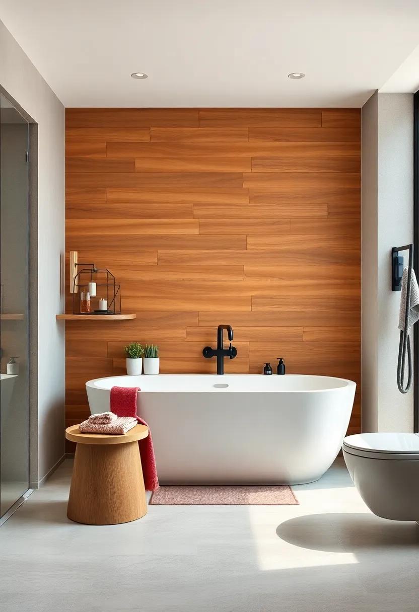 Transform your bathroom into a cozy retreat by adding a warm wood accent wall behind a large, inviting bathtub for a touch of rustic charm