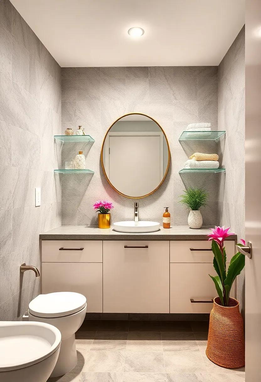 Integrating a floating vanity with open shelving above can transform your powder room into a chic and functional space. This design choice not only maximizes your area but also creates a visually pleasing aesthetic. A floating vanity lifts the bathroom decor, making the room feel more spacious and contemporary. When combined with open shelves, it allows for easy access to everyday essentials while showcasing decorative items. Choose shelves that complement your vanity style—consider sleek wood finishes, minimalist metal frames, or even glass for a touch of elegance.
