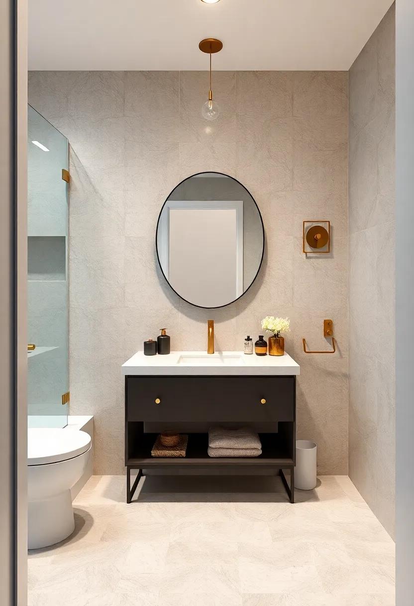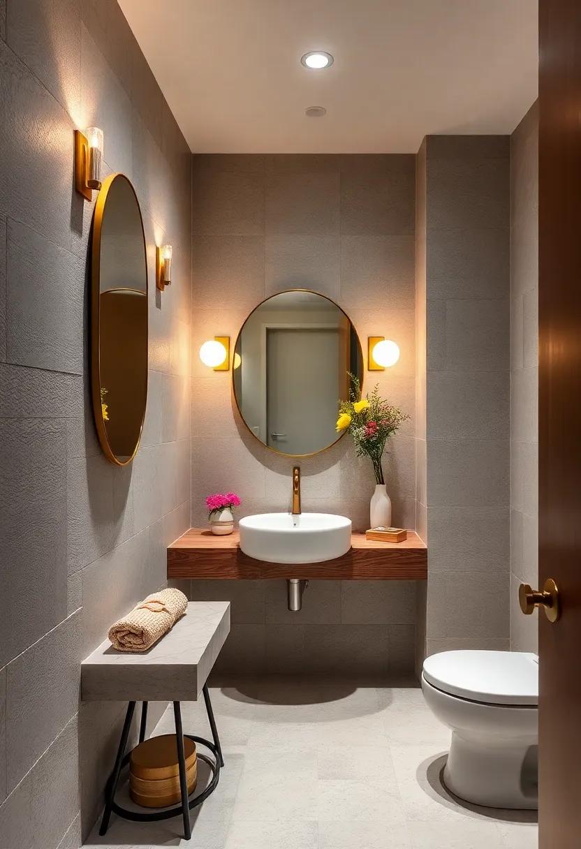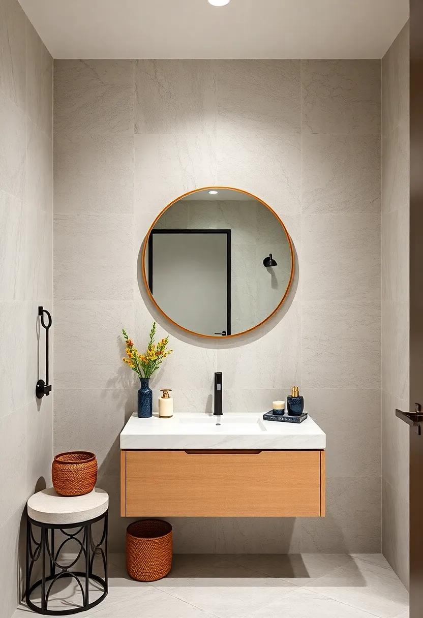 Incorporating a round mirror in your powder room can effortlessly elevate the aesthetic of the space. The smooth, curved edges of the mirror contrast beautifully with geometric lines present in the vanity or tile patterns, creating a visually stunning effect. Opt for a thin metallic frame to add a sleek touch, or choose a matte finish for a more subdued, modern feel.This combination not only draws the eye upward, expanding the sense of space but also introduces a balance between softness and structure, making your compact area feel more open and inviting.