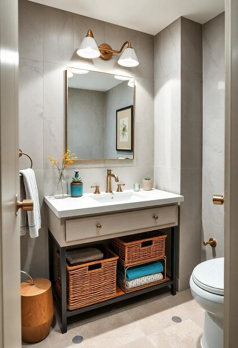 Transform the often neglected space beneath your vanity into a stylish storage solution with wicker baskets or decorative boxes. Wicker baskets not only add warmth but also create an inviting texture that brings a touch of nature indoors. Group them in various sizes to optimize the available space, while the softer edges offer safety and a less cluttered aesthetic. Consider labeling each basket for quick access—this allows you to maintain that clean look without sacrificing functionality.For a more polished approach, decorative boxes in neutral or coordinating colors can help tuck away less appealing items like cleaning supplies or extra toiletries, keeping the space organized yet refined.